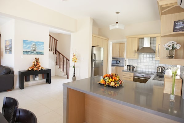 This is a really good, well appointed villa. It's a 10 minute walk from the pretty village center where there are several good quality restaurants. Just be aware, Pissouri is built on a hill - it's uphill on the way into the village, thankfully downhill on the way back. Pissouri beach is a 5 minute drive away, pebble rather than sandy, but good water sports facilities, we used Chris' - excellent.