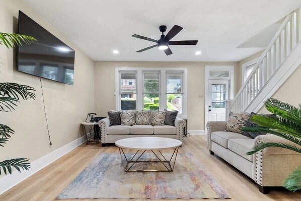 With two cozy queen beds, a fully equipped kitchen with a keurig, utensils, and cooking supplies, and lots of closet space and seating in the living room, our duplex is the perfect place to unwind after a day in the city. However, note that the first full bathroom is on the second floor, and the second full bathroom is in the basement. It's our joy to make your stay comfortable and memorable!
