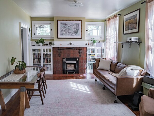 You will love the quaint character of this house. Built in 1906, it has a very eclectic, historical feel and has retained many of its original features and charm. The first floor features a full kitchen with a stove, refrigerator, pots and pans & cooking utensils, and a coffee pourover with stocked coffee and teas. There is a dining room and living area with a projector and sound system that easily connects to a laptop. Guests are welcome to use the medical grade air filtering unit provided. We have provided fresh sheets, towels and basic toiletries. The second floor features a large bedroom, additional guest bedroom and bathroom. You will find original artwork throughout the house to enjoy. Perfect for couples, solo travelers, business trips, or anyone looking for an extended stay.