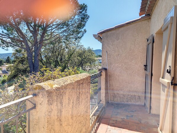 Al piano superiore, una camera con 2 letti da 80 cm che possono essere uniti, 1 camera con un letto da 160 cm e la sua lunga terrazza che offre una vista sulle colline.
