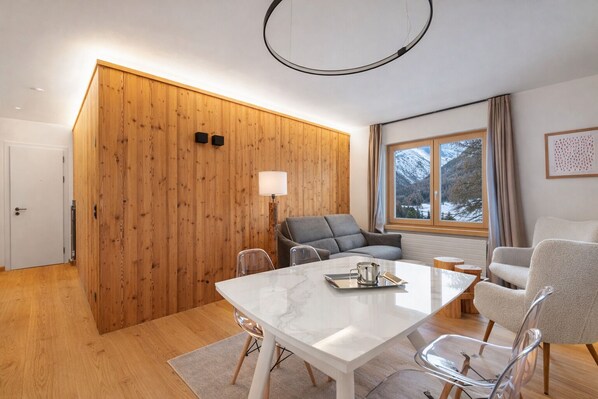 Appartamento moderno e luminoso a Pontresina, a solo 6 minuti da St. Moritz. Due camere, un bagno, zona giorno con divano letto, TV, tavolo da pranzo e cucina completa. Design pulito con finiture in legno e vista sulle montagne. Perfetto per famiglie, coppie o amici che desiderano comfort e stile in una posizione tranquilla con parcheggio incluso.