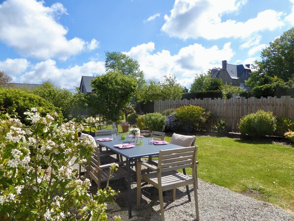 The house features large windows overlooking the garden, while the terrace faces south-southeast. It is nestled in a lush, green setting yet conveniently located about 500 meters from the town center of Port-Bail-sur-Mer, a charming, family-friendly seaside resort in the Cotentin region of Lower Normandy. Port-Bail offers a sailing school, land sailing activities, a small port, and a vast sandy beach accessible via a scenic seaside promenade, starting at the iconic 13-arch bridge (about 2 km between the bridge and the entrance to the main beach).