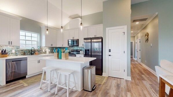 With over 1500 square feet, the home easily accommodates 6. The primary bedroom features a king bed and an ensuite bathroom. Bedroom two features a queen bed, and bedroom three features a queen bed. All bedrooms have televisions, and high speed internet is provided for your devices, as well!