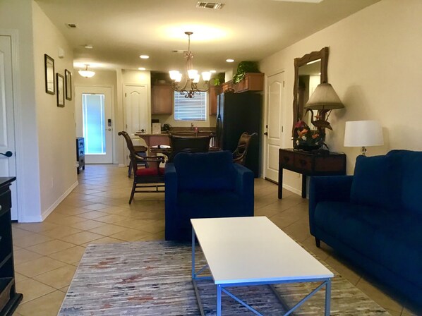 Questa Casita ha una zona giorno aperta che ha molto spazio e posti a sedere per riunioni di famiglia o di gruppo. Questo soggiorno ha un divano letto estraibile e una TV a schermo piatto per riunioni di gruppo o per sedersi e guardare film di famiglia.