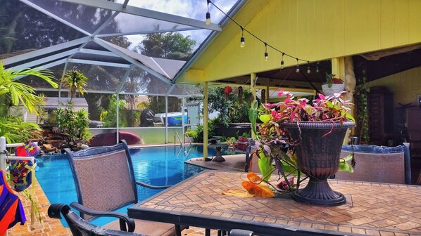 We enjoyed our stay at beautiful Hawk’s Nest. The tropical setting is gorgeous! Our family of 13 (8 adults and 5 children) loved the heated pool, pretty waterfall, aquarium and hot tub. We took lots of walks in the quiet, residential neighborhood. We were close to several children’s playgrounds, the Port St Lucie Botanical Gardens and about 30 minutes from the ocean. We ate most of our meals at the house. The kitchen has lots of prep areas, 2 ovens, 3 dining tables (2 on the outdoor patio) and 12 additional stools. The propane gas grill worked well.Hawk and Mandy were quick to respond and addressed any issue we encountered.