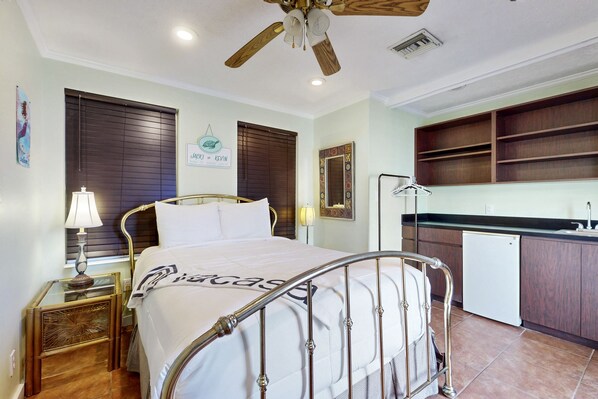 Enjoy spectacular sunsets from bay windows and fully-screened porch or soak up some rays on the front deck and patio. Even more sun and fun at beach is just a short stroll away. A furnished picnic area in the private, enclosed backyard is the perfect place for a family cookout and comes equipped with an outdoor shower and hose to rinse yourself and gear when you return from a day at the beach. Hang swimsuits and towels to dry on the clothesline. If you find you need a fresh pair of clothes during your stay, an outdoor laundry area featuring a private washer/dryer is also available. Inside, you'll find a well-equipped, full kitchen with plenty of accessories to help you whip up your favorite recipes as well as a convenient wet bar in the bedroom. Dine together or play a few board games at the table for four, and then settle into the living area to watch TV. For modern convenience, wireless internet is available throughout.
