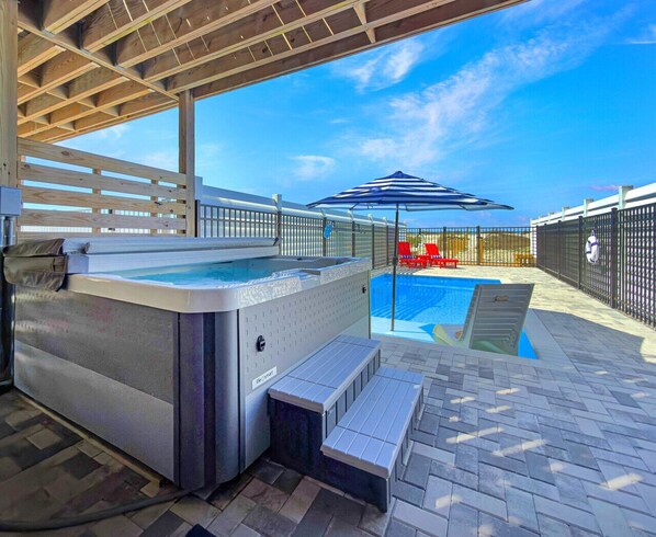 • Outdoor Living: Two spacious decks, new pool + hot tub, outdoor shower, covered parking