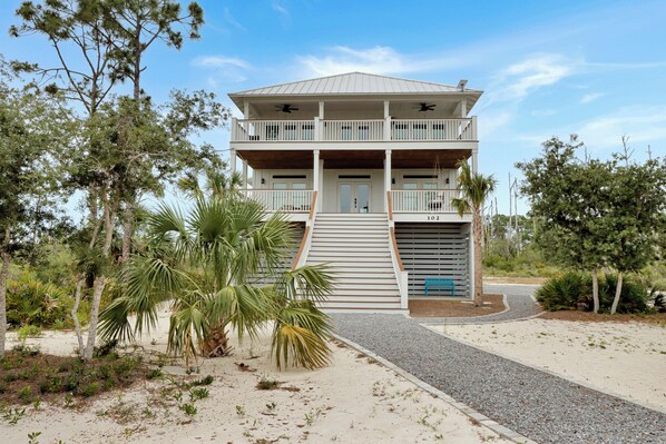 The top floor offers a bright, open living area surrounded by windows, a spacious kitchen with a large island and pantry with a second fridge, and access to a screened deck with peaceful views. There's even a quiet workspace tucked away for those who need it. With parking for 6 vehicles, two enclosed garages, an elevator, an outdoor shower, and a golf cart available with deposit, Home Away from Home has everything you need for a relaxed, comfortable, and unforgettable beach getaway.