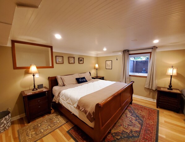 Con oltre 900 piedi quadrati, questo appartamento per gli ospiti con una camera da letto dispone di un lussuoso letto a slitta king in legno di ciliegio con un materasso Helix personalizzato in memory foam ibrido / bobina. La TV girevole da 50 ”a parete con Amazon Prime e Netflix consente una visione piacevole dal divano o dal letto. Il divano si ripiega anche su un letto matrimoniale con materasso in memory foam e topper. Un'unità portatile A / C è disponibile, se necessario, ma il camino elettrico a infrarossi (con telecomando) vede molto più uso in città che celebra il sole liquido.