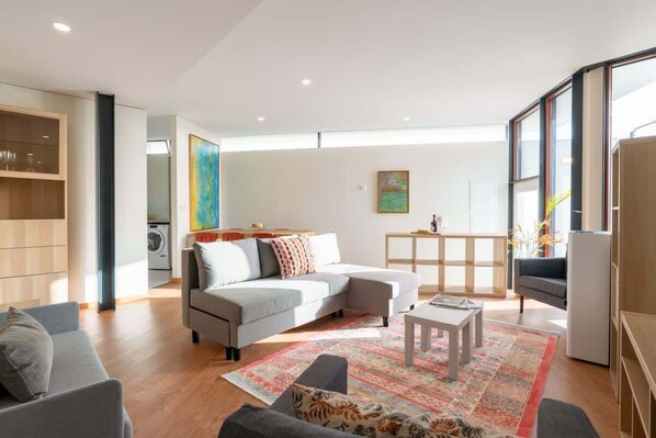Living Area with a View: Relax in the spacious, light-filled living room where you can admire the breathtaking view of the D. Luís Bridge, adding a unique touch to your Porto experience.