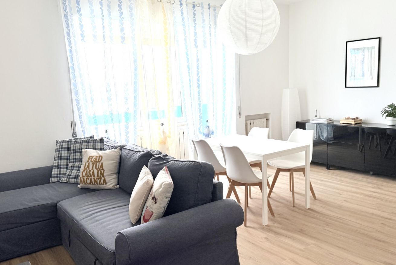 Soggiorno con divano letto matrimoniale, tavolo con sedie ed angolo cottura completamente attrezzato con lavastoviglie, forno, microonde e macchinetta del caffè - camera con letto matrimoniale - bagno con doccia.