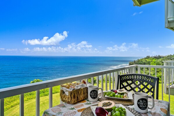 Inizia la giornata con caffè o tè sull'ampio lanai. Questo trespolo ventilato vanta le migliori vedute di Princeville sulla barriera corallina di Anini. Un prato lussureggiante conduce fino al bordo dell'oceano - un set di sedie offre un altro bel posto per ammirare il panorama.