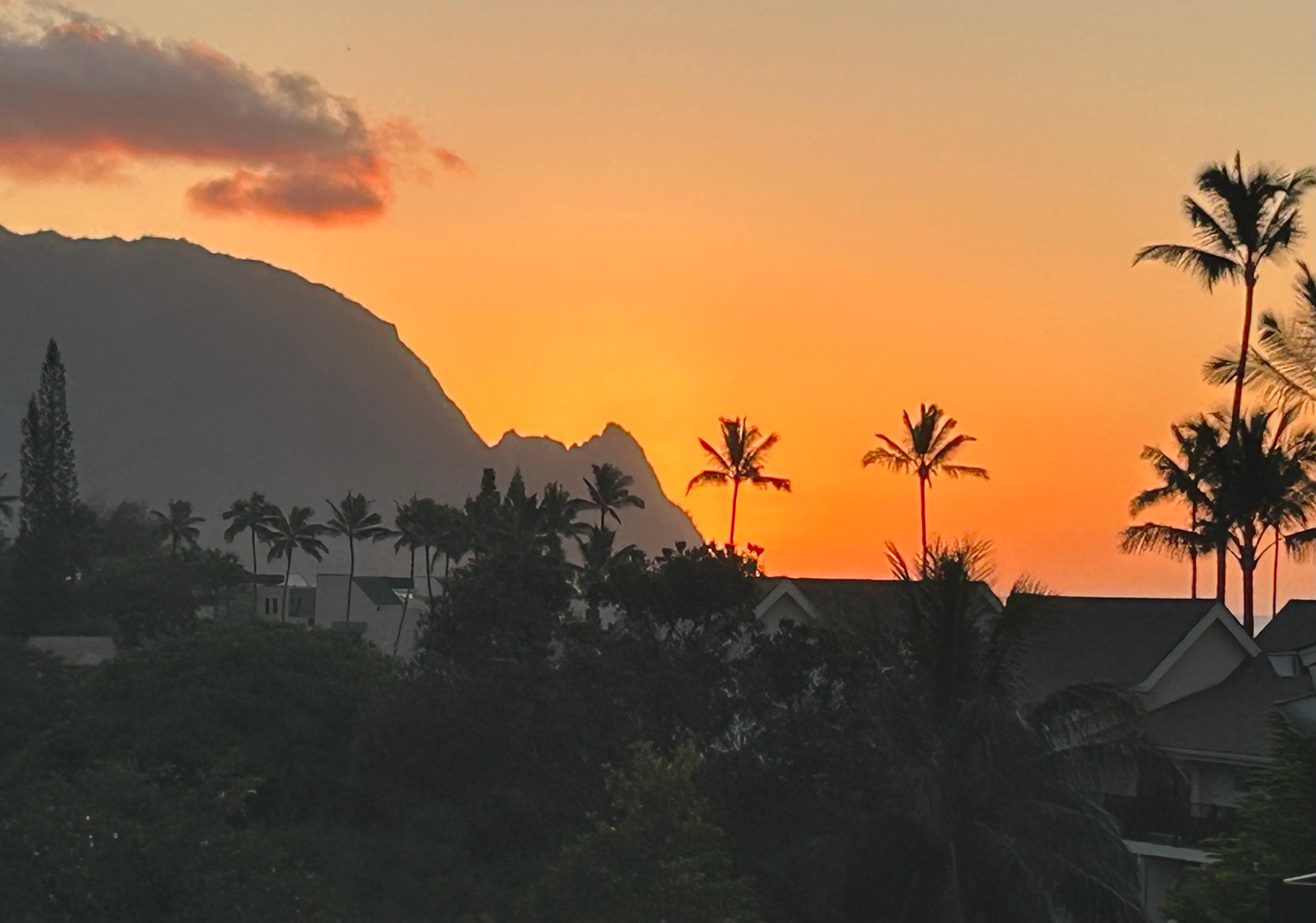 The view from our condo is a spectacular showcase of the unspoiled beauty of Kauai. Off the lanai to the right, take in a breathtaking view of Makana Mountain, the oceanside mountain peak made famous as Bali Hai in the movie South Pacific. Enjoy sunsets right on the lanai as the evening sky comes alive with a kaleidoscope of tropical color. Looking directly off the lanai (or from the inside of the studio) is a lush, tropical greenbelt (alive with birds chirping in the morning) and the Namolokama mountain range. After rain showers, you can see one, two, or even dozens of cascading waterfalls. Experience it all without leaving your condo!