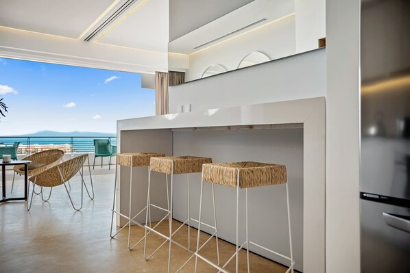 >Flexible Second Bedroom Space – Located in the living area and designed for versatility, this space features a queen-size Murphy bed, sliding pocket doors to create privacy, and captivating views of Puerto Vallarta’s skyline and ocean.