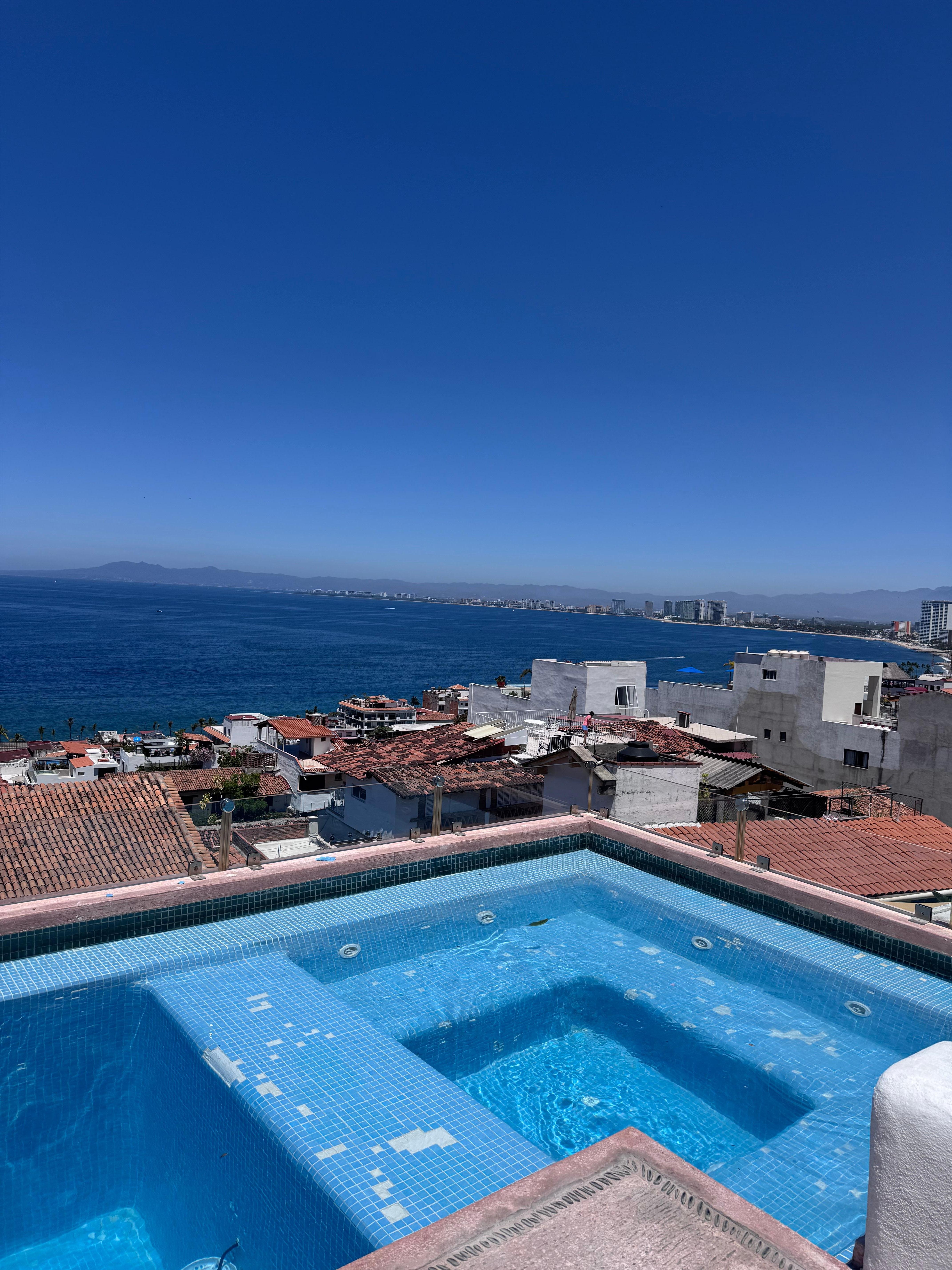 I absolutely LOVE this place. We will be back for sure. It was the perfect stay for our 25th anniversary. It's a charming, small boutique hotel with lovely staff and each room is unique with special touches. We stayed in Sol 2 for the first 4 days. It has a balcony with a view of the cathedral and bay and king size bed. Really tall trees prevent people from looking into the room so you can keep the curtains open and still have privacy, or close the black out shades for dark and quiet. We stayed in Tortugas 1 for 4 days on the 2nd floor- king bed, cool shady room by a fountain and lush courtyard. A/C in all rooms. Every morning from 7-10:30 they serve coffee, a fresh fruit plate and toast to each guest in an open dining area next to the kitchen. We often saw whales in the bay while eating. Both kitchens are open for all guests to use. The roof top pool and lounge is a wonderful luxury. It has a medium sized pool with a 180+ degree view of PV and the bay, a palapa covered sectional, loungers and several tables for eating or playing games. Excellent for sunset/sunrise, reading and cooling off after hiking up the hill. THIS PROPERY IS NOT FOR PEOPLE WITH MOBILITY LIMITATIONS. The walk to the property is up a VERY steep hill and the property is 4 stories without an elevator. It takes some getting used to the walk but in my opinion, this place is completely worth it. The exercise helped me justify my food and cocktail excesses. The staff are a delight as well.