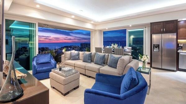 Estrella Azul is a luxurious condo located in the hills of the West Coast, where mesmerizing blue ocean meets the vibrant city life. This opulent space offers an elegant and spacious living area complete with state-of-the-art technology, where you can enjoy breathtaking views of the surrounding hills and ocean. The windows let in natural light, and the private balcony is the perfect spot to enjoy the sunset, evening fireworks, or a morning coffee.