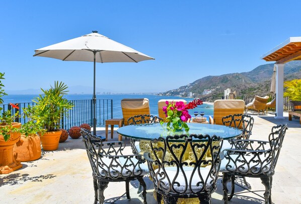 Dalla corsia di ciottoli, sblocca il cancello ad arco in ferro battuto e sali su un patio privato con pareti con piscina e fontana. All'interno dell'affascinante casa con le sue tradizionali pareti imbiancate a calce, i soffitti con travi a vista e i pavimenti in piastrelle di terracotta, preparati a lasciarti stupire dalle ampie viste sull'oceano dalla zona soggiorno-pranzo a pianta aperta, dalla cucina e dall'ampio patio aperto. Da qui, ti cullerai nel perfetto stato di relax dalla vista e dal suono dell'oceano e dalle viste intorno alla baia di spiagge, alle drammatiche colline costiere e alla Puerta Vallarta in lontananza. (Di tanto in tanto è possibile avvistare anche balene e delfini!)