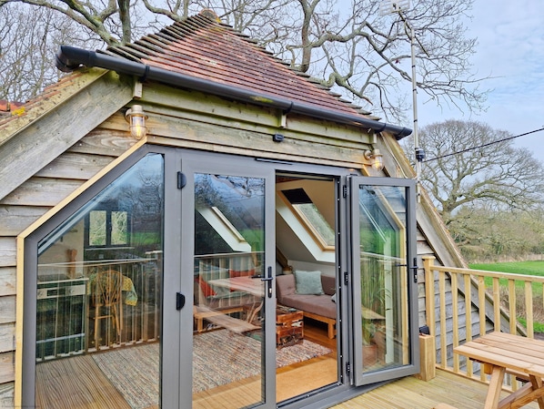 Beside the main house is an open garage with studio annexe above, which is separated from the main house. You will find a fully furnished and equipped studio with a king size bed and en suite shower room, a kitchenette with an oven, electric hob, fridge, kettle and toaster and small lounge area. There are large fully glazed double doors onto the balcony with a seating area where you can enjoy spotting a variety of birdlife including kestrels and local barn owls that nest nearby.