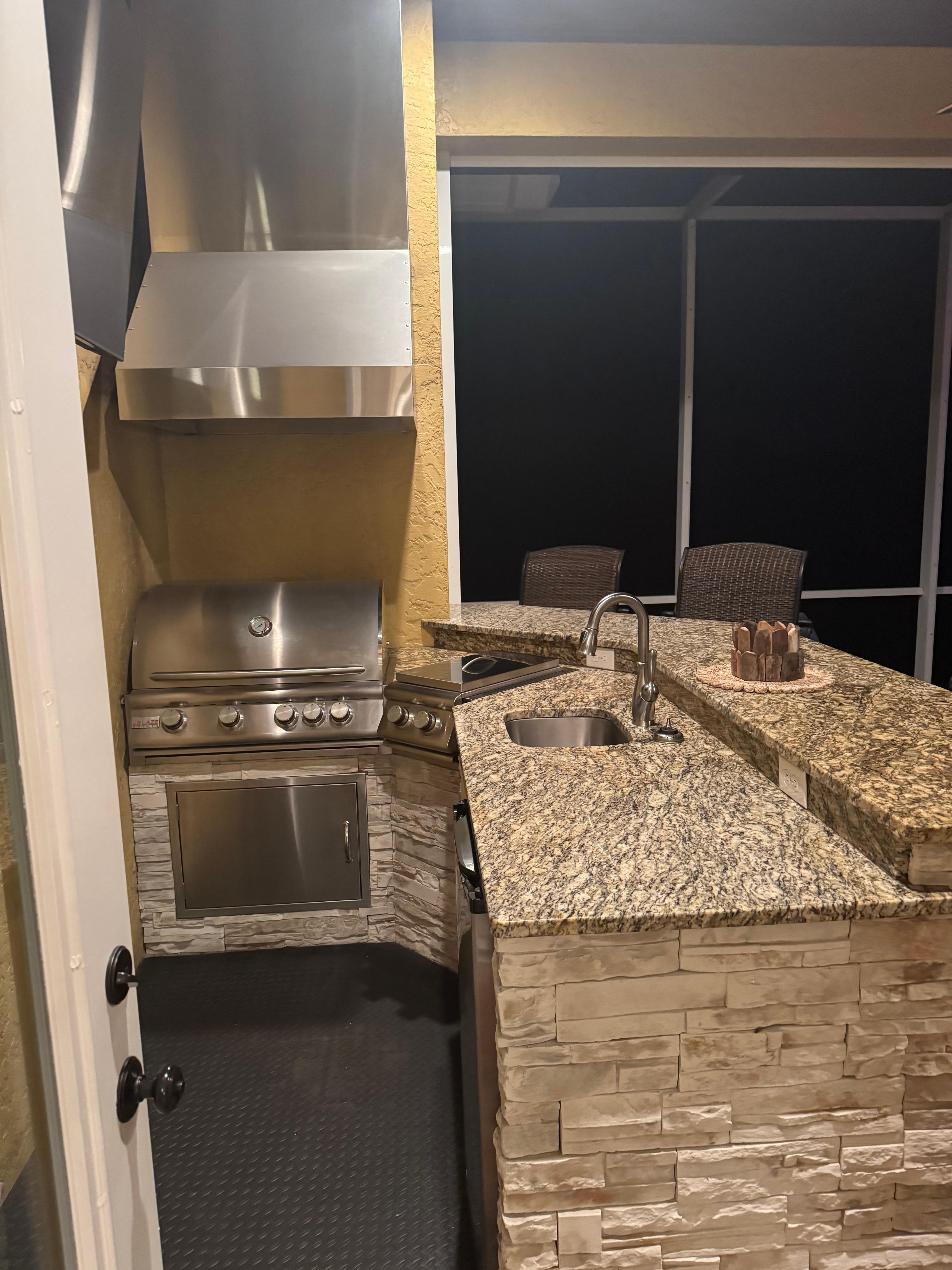 * Outdoor kitchen featuring a propane BBQ grill & stovetop, sink, mini fridge and 65-inch Smart TV