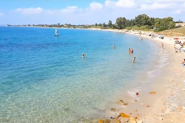 Beautiful two-family villa recently renovated and developed on two floors with 3 bedrooms and 2 bathrooms only steps away from the sea. Perfect for families or friends. The vast garden is dotted of exotic trees, a ping pong table and a fire pit and is completely fenced. Possibility to park inside the private gate. The villa is located in the suburban beachfront neighborhood of Capitana. Quiet and safe area with plenty of free street parking. The villa is a 5 minute walk to the nearest sandy beach, grocery store, restaurants and the Marina of Capitana, that offers a bar, restaurant, boat rentals, car rentals, scuba diving and snorkeling. The Sighientu Resort is also a short walk away where you can book treatments and pay to use their spa facilities. Within a few minutes drive from many of the most beautiful beaches in Sardinia and the Sette Fratelli national park with hiking trails. The kitchen is fully stocked. The home is equipped with brand new A/C units, WIFI, EV charger, a dishwasher and a washing machine. Baby cot available upon request. Two bedrooms have a queen sized bed, third bedroom has two single beds. Living room has a queen sized sofa bed. Outdoor kitchen (countertop, sink and BBQ), two verandas, one balcony. All trash must be removed from property by the time of checkout. We provide the schedule to take out the bins every night and a location where you can bring any leftover trash on your last day. Leaving any trash at the property will result in a 150€ fine. Coffee, tea, olive oil, salt, pepper, sugar, toilet paper, paper towels, soap, shampoo, body wash, trash bags, dish soap, sponges, kitchen towels, bath towels and bed linens are all provided for an easy, stress free vacation. Relax in this quiet and all inclusive home.