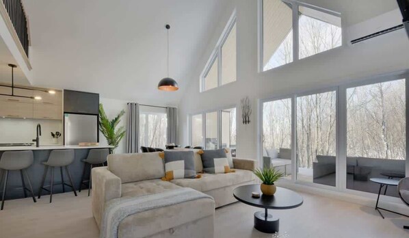 Bienvenue au Charmant Boisé, un chalet chic pouvant accueillir9 personnes. Avec 3 chambres, 3 salles de bains et une mezzanine confortable, il est parfait pour les familles ou amis. Les intérieurs ensoleillés disposent d'un salon spacieux avec foyer, d'une salle à manger et d'une cuisine élégante. Les enfants disposent d'une zone de jeu et les professionnels d'un espace de travail. Vous pourrez vous détendre dans le spa privé ou sur la terrasse, alliant le luxe moderne au charme de la nature.