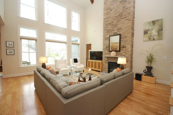 La casa ha una spaziosa hall che conduce alla grande sala drammatica a 2 piani con camino in pietra dal pavimento al soffitto, TV a schermo piatto e cucina di lusso aperta con ripiani in granito, elettrodomestici in acciaio inossidabile e isola con quattro sgabelli. C'è una sala da pranzo fuori dalla grande sala che può ospitare fino a 10. Ci sono 2 camere da letto (tra cui master) / due bagni completi al piano principale e 3 camere da letto / due bagni al secondo piano (grande camera da letto al 2 ° piano ha bagno privato). La camera da letto principale con letto king size, situata al piano principale ha una sedia e ottomana, TV a schermo piatto, cabina armadio enorme, e bagno privato con doccia molto grande che ha una panchina costruita e due docce, acqua separata armadio per servizi igienici e 2 vanità.