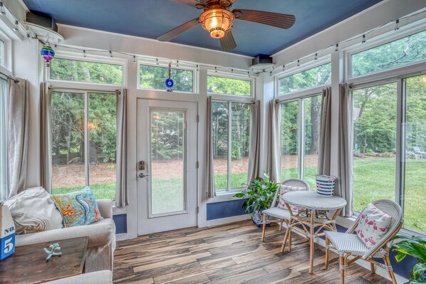 Entering the house is the foyer area where stairs lead to the second level. There is also a half-bath, hall closet and entry from the one car garage. Once leaving the foyer area you head into the open concept Kitchen, Living Room and Dining area perfect for large gatherings. The Living Room features a flat-screen TV, DVD player (We provide a wide selection of DVD’s) and plush seating (which includes a queen sleeper-sofa) for watching TV and is perfect for relaxing during a movie. Enjoy preparing a meal from the spacious bright fully stocked kitchen with a large island (overlooking the living/dining area) which also has 3 stools, granite countertops, stainless steel appliances & pantry. A dining room table for 6-8 people fits the entire family for dinner. The 4-season room is located off of the living area which gives more room for entertaining and additional eating space during any weather plus has an entrance to the backyard.