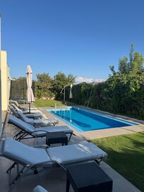 We just stayed ten days in Villa Margo in Gallou, ten minutes drive outside of Rethymno. The villa was absolutely stunning. Fantastic space in all bedrooms, spotlessly clean everywhere, great living and dining room areas plus two huge terraces with stunning sea and mountain views. Kitchen very well equipped, plenty of towels, lovely bathrooms. The pool area is exceptional. Lovely size pool, plenty of sunbeds with big umbrellas and tables. There is a washing machine and plenty of room to dry everything which made life easy. We had a resident cat repeatedly come into the house which was fun. Friendly enough but slightly unhinged! Rethymno itself is stunning. So many wonderful places to eat and drink, lots of lovely shops, plenty of beach with hundreds of sunbed options which are very reasonable at 10 for two for the day with a little table and umbrella. The villa was the perfect distance away. We hired a car but easily found a taxi number which you WhatsApp to order, they were efficient and always charged the same, 15 each way. The owners of the villa were on hand, very friendly and helpful but not intrusive at all. We had full use of all four bedrooms, the living and dining areas, pool and garden and space on the drive to park. We really could not have wished for a better stay and are already looking at taking friends there next year as we loved the whole set up so much. Would highly recommend Villa Margo, we had a fantastic time. Thank you to our hosts.