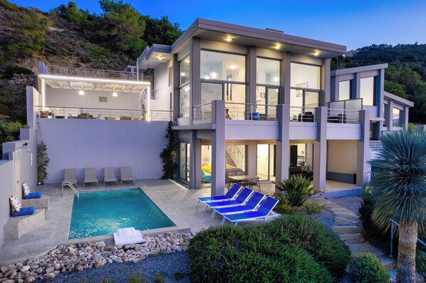 La villa è altrettanto impressionante all'esterno, circondata da un giardino con un 7x3. Piscina 5m dotata di comodi lettini e barbecue. La villa offre anche ampie verande arredate che creano luoghi ideali per rilassarsi con un libro e un drink. Le verande sono ideali anche per incontri con amici e familiari e cene all'aperto. La villa si trova alla periferia della zona di Faliraki, a breve distanza in auto dal centro. A meno di 15 minuti a piedi dalla villa, i visitatori possono trovare numerosi negozi, supermercati e ristoranti. La spiaggia di Faliraki si trova a 1 km dalla struttura ed è completamente organizzata con lettini e ombrelloni a noleggio, nonché sport acquatici e attività. L'aeroporto dista 18 km e il porto 15 km.