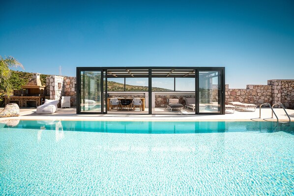 L'area esterna privata comprende una piscina, un giardino, una terrazza coperta, 3 balconi, un barbecue e una doccia esterna. La proprietà ha accesso a un'area esterna condivisa che comprende una terrazza aperta.