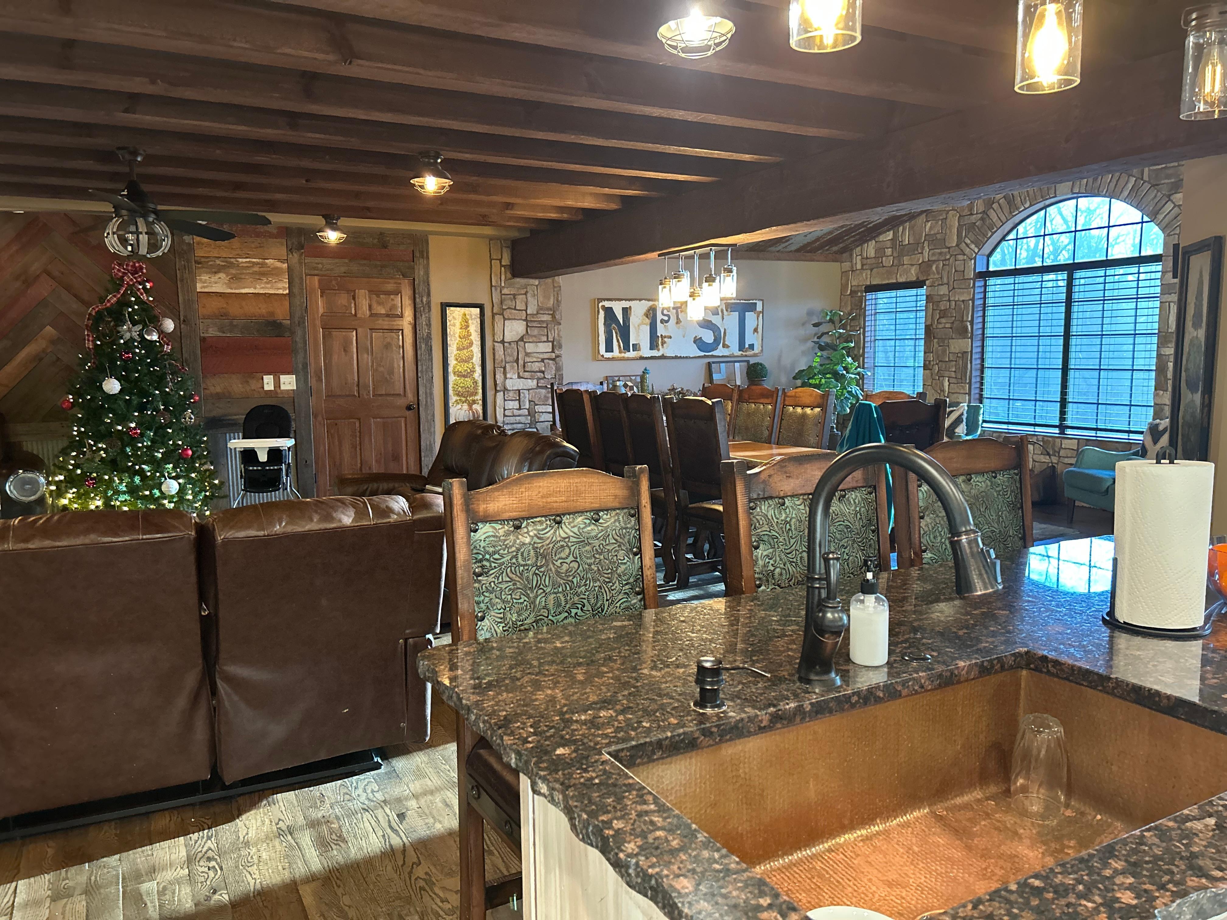 Step inside and feel right at home with wood beam trusses, barn tin ceilings, and a massive 10-foot solid wood dining table—perfect for big family meals or corporate gatherings. The fully stocked kitchen boasts rough-edge granite countertops and a copper sink, making meal prep a breeze.