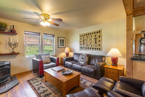 Watch vibrant sunrises and unforgettable sunsets from the spacious upper deck, or gather with loved ones in the welcoming main living area, complete with a pellet stove, large flat-screen TV with Roku, and a well-equipped kitchen and dining space. Outside, enjoy meals on the deck, fire up the gas grill, and roam the expansive outdoor space and natural surroundings.