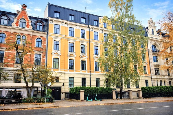 The apartment is Ideal for 1-4 guests. The main entrance from the facade of the building. Located on the first floor. Windows are facing the courtyard and Elizabetes street.