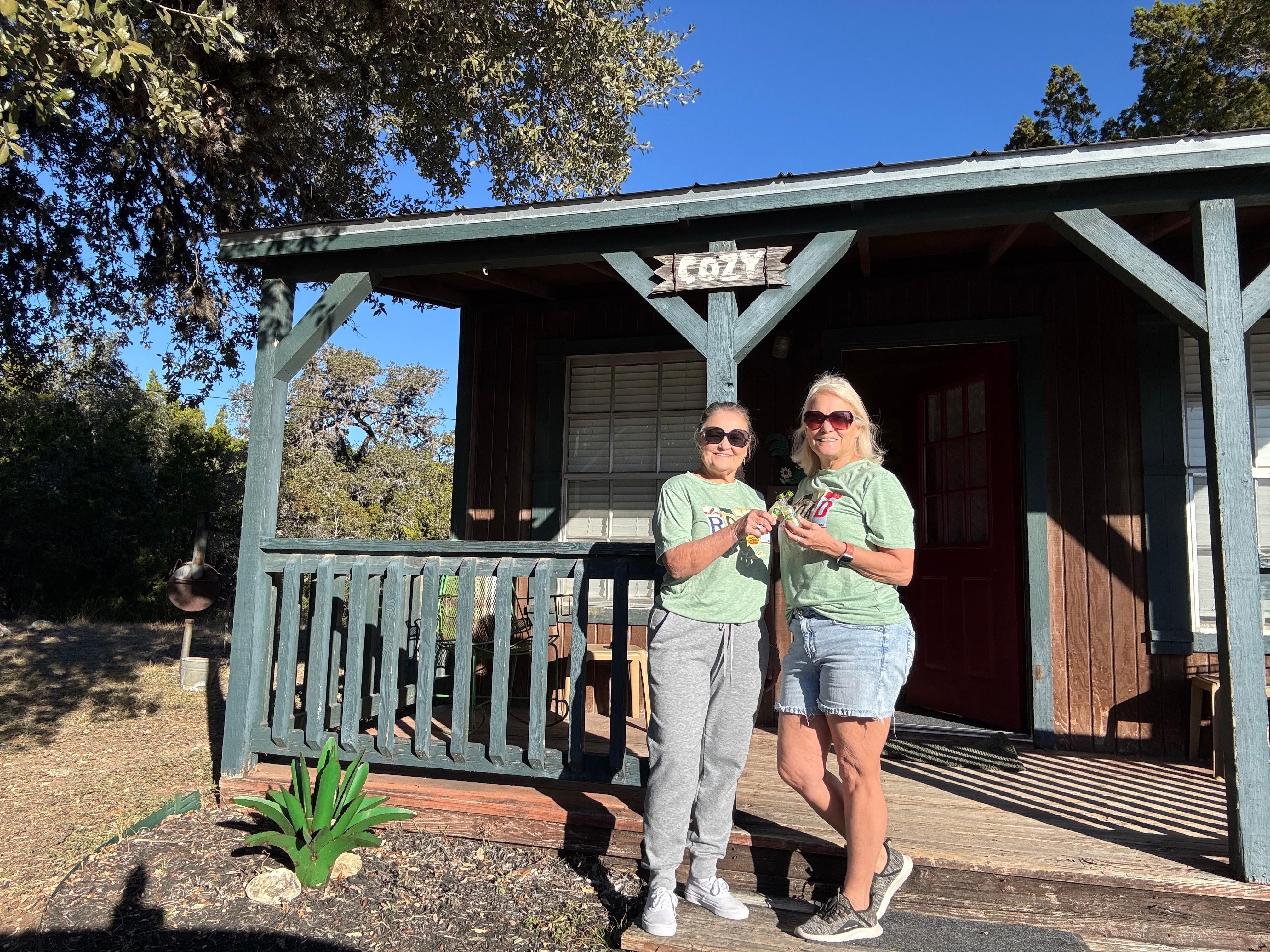 2 posti letto - Questa cabina offre un letto matrimoniale, doccia, TV, cucina, riscaldamento e aria, tavolo da picnic, barbecue e 2 sedie a dondolo su una veranda coperta.