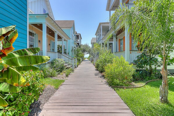From the front entrance/porch area of this beautiful two-story retreat, you will find a boardwalk that leads you either to the community pier in one direction or to the community pool in the other. You can sit on the front porch steps and have a view of the bay. Treat your loved ones to delicious grilled treats using the provided gas grill. Inside, hang out with your beloved group in the living area - snuggle up on the sofa of your choice and stream a favorite movie or series on the smart TV. When mealtime comes around, let everybody gather at the six-person dining table while you serve them their favorite dish. The fully equipped kitchen is complete with everything you need, including a dishwasher for easy post-meal cleanup. Additional amenities include a washer/dryer, board games, DVD movies, and kids' books. Guests can access the upstairs balcony from the primary suite. There is access to the upstairs balcony furnished with two chairs and a side table from the primary suite.