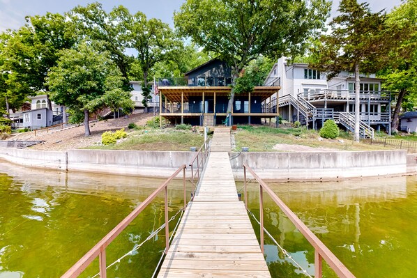 This spacious home boasts a renovated interior and direct waterfront access, with tie-on mooring for boats or kayaks and an Aqua Lily Pad for getting out on the water. The neighborhood's no-wake zone makes it an ideal spot for swimming and fishing as well. Osage National and The Ridge Golf Courses are both within a short drive, as are the town center of Lake Ozark and Osage Beach shops, restaurants, and family-friendly amusements. When you're not out on the water or exploring, take in lakefront views from one of the two private decks or challenge your guests to some friendly competition in the home game room.