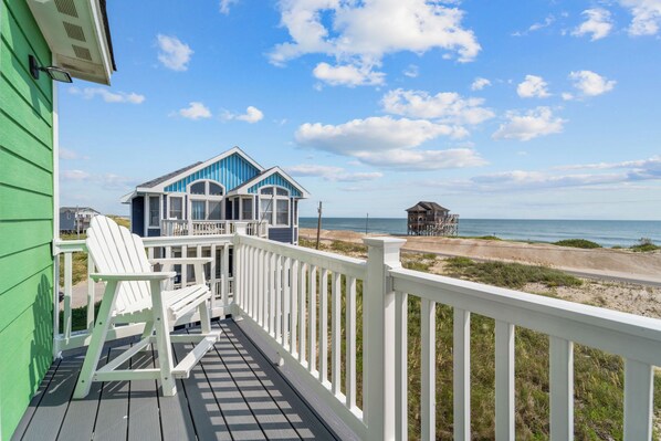 Four more bedrooms are located on the second level including a king master with a full bath and access to the front deck; a king master with access to the back deck; and a queen bedroom and queen bedroom that share a hallway bath. The final bedroom, a king master with access to an ocean-facing deck features a bath with a two-person shower, dual vanity sink, and walk-in closet. All the bedrooms include ceiling fans and Smart TVs.