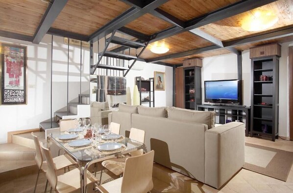 L’elegante soggiorno al piano terra dà la possibilità di organizzare pranzi o cene di lavoro o con gli amici.