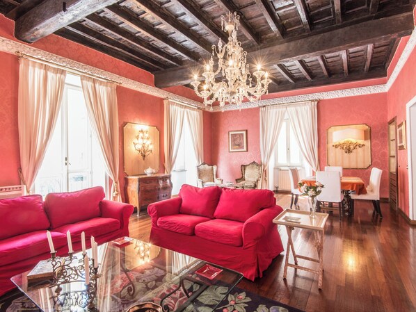 This is an extremely elegant apartment with really special personality, blend of Italian antique furniture. This four bedroom apartment is situated on a super bright first floor of a beautifully preserved building with an elegant entrance. The apartment is composed by a double entrance, a large double living room with a dining area and fireplace, three double master bedrooms, one single bedroom, three bathrooms (bathtub and shower), a large kitchen and an astonishing lovely balcony overlooking via della Croce.