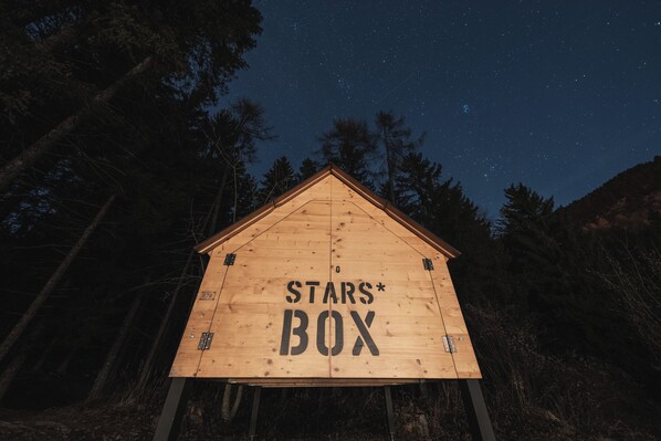 Scopri la magia della StarsBOX: un rifugio immerso nella natura, con tetto apribile per ammirare il cielo stellato e un materasso riscaldato che ti avvolge in un caldo abbraccio. Silenzio, profumo di bosco e notti indimenticabili ti aspettano.