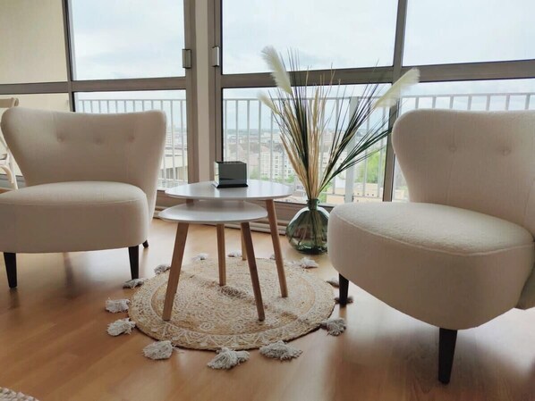 On arrival, you'll be greeted by a spacious entrance hall leading to all the rooms in the flat. The fully-equipped kitchen (Nespresso coffee machine, toaster, microwave, oven) lets you prepare delicious meals, which you can enjoy in the bright, comfortable living room, while taking in the panoramic view of Rouen's left bank. If you prefer some fresh air, you can relax on the balcony and admire the view.