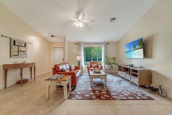 This modern home is your cozy home away from home. The masterpiece, our Florida room offers guests a desk, a lovely chaise lounge and queen-sized day bed styled for rest and relaxation. This home is very spacious with lots of natural light, well ventilated but is also fully air-conditioned.