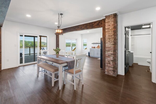 Built in 1932, this home is full of history and still has some of the original brick and wood accents and they're exquisite. This Riversuite1 - THE VIP is a 4 private bedrooms, 1 bedroom semi-private as it’s got two doors but one is the main entrance. This was the office but everyone jerk adding our air mattress to the room so we just put a bed In there too. 2 bath unit that sits on the bank of the Ohio where you'll be mesmerized by the water as it flows down towards the Mississippi. The spectacular river and bridge view is often compared to some of the most beautiful scenic views from around the world. As you relax in the living room or out on the enormous, covered deck and you'll quickly begin to relax as the view melts away any stressors you may carry.