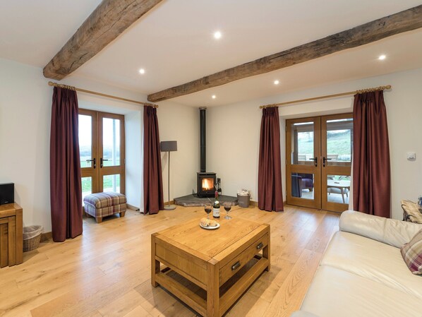 Soggiorno: con stufa a legna, 42 "Freesat TV, lettore DVD, lettore CD, PlayStation 4, cestino del giocattolo, pavimento in legno e porte francesi che ...