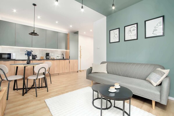 The apartment has been designed with a romantic stay for two in mind, though it can comfortably accommodate up to three guests. The interior combines modern and minimalist style with cozy accents, creating a harmonious and peaceful atmosphere. The heart of the apartment is the living room with a comfortable sofa, where light mint and white walls, combined with abundant natural light, create a pleasant and relaxing space. Evenings can be spent watching favorite films on a 50-inch television with access to streaming platforms such as YouTube and Netflix. The living room flows seamlessly into a modern kitchenette, featuring mint and wooden toned cabinets. The kitchenette is equipped with an induction hob, microwave, dishwasher, and drip coffee maker, while the toaster and dining table make breakfasts and romantic dinners enjoyable. The bedroom is distinguished by a dark gray wall contrasting with the remaining white walls, and the comfortable double bed, 140 cm wide, ensures a restful sleep after a day full of experiences. The bathroom is finished in a modern style with gray tiles, wooden accents, and flooring, while the black-and-white fittings add a touch of elegance. It includes a shower and washing machine, providing great convenience for longer stays. Additional equipment such as an iron, ironing board, and clothes dryer ensures full comfort. The apartment welcomes pets, making it an ideal place for traveling with a beloved companion (for an additional fee).
