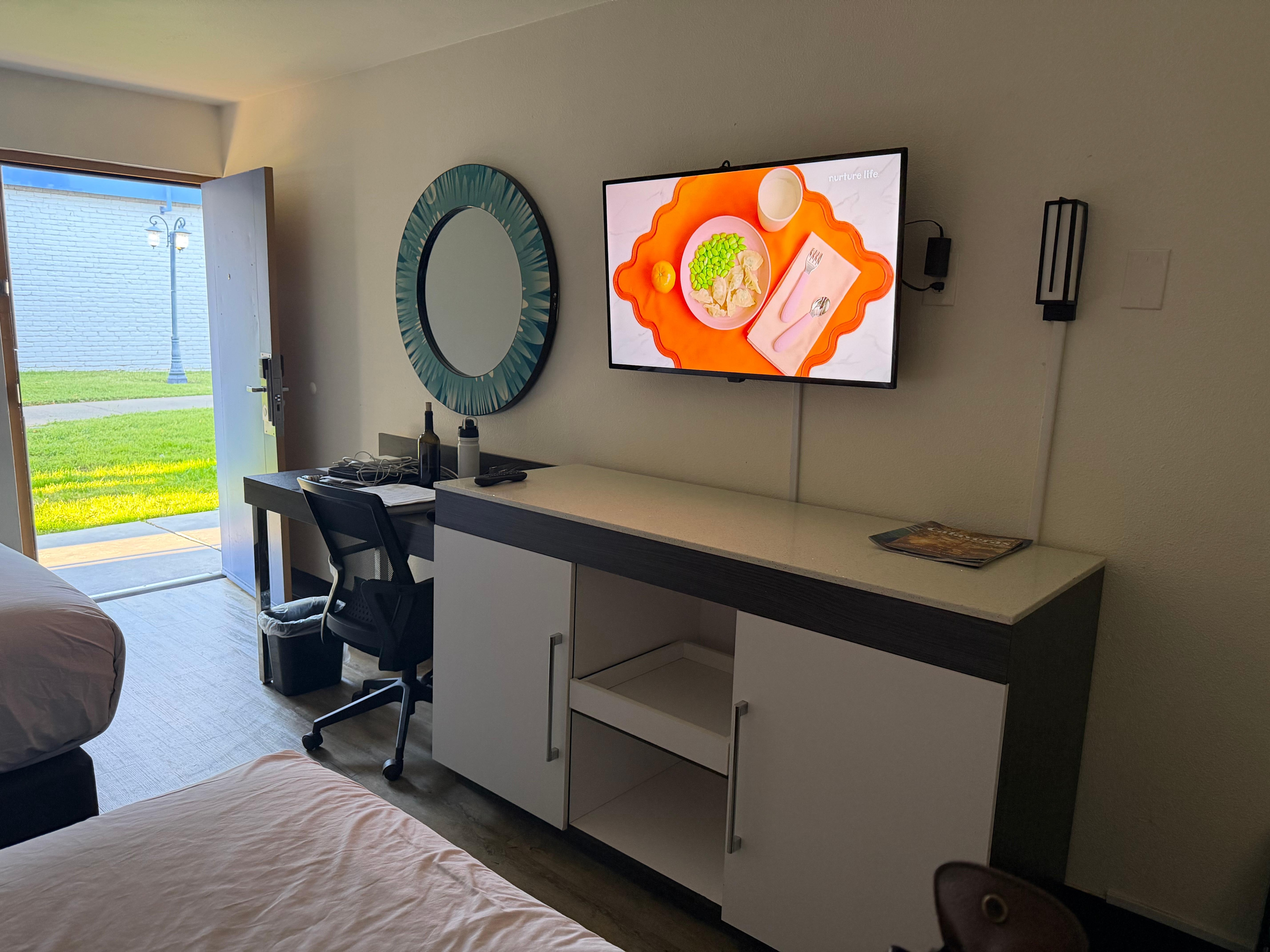 Great room, newly remodeled with a marble shower and nice amenities and furniture. Tall beds though and a very tall desk that was rough on the shoulders for typing. And noisy squeaky beds wake you up if you toss and turn a little. Didn’t sleep that good… Such a nice property though for the price. Huge pool! Drained jacuzzi.