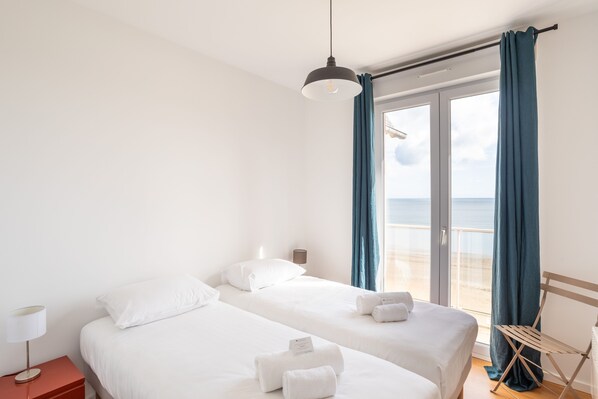 - A double bedroom (2 single beds can be joined together), en-suite bathroom, sea view.