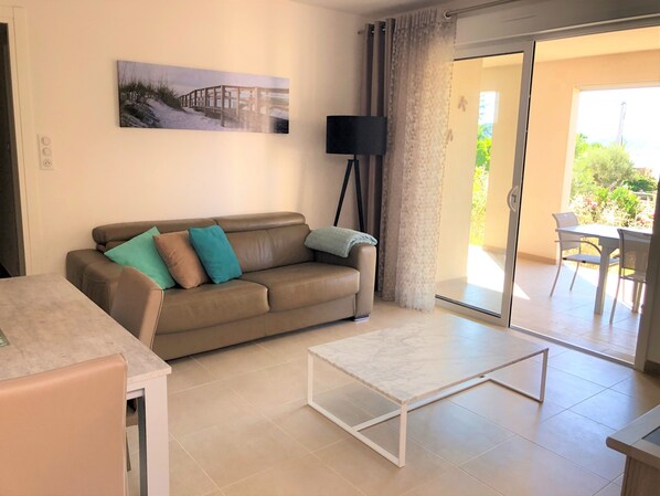 la Villa è composta da 2 splendide camere da letto di 12 m2, una delle quali è dotata di TV, 1 bagno con doccia, 1 WC, 1 cucina attrezzata, un soggiorno cucina di 25 m2 con divano letto. all'esterno troverete una bellissima terrazza di 30 m2 con mobili da giardino per 6 persone, una Plancha.