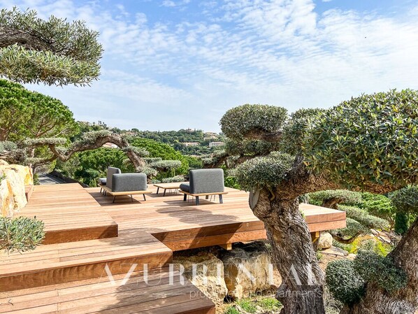 Di fronte al soggiorno e alla sala da pranzo, così come alla cucina, ampie terrazze parzialmente coperte sono dotate di una suite-soggiorno e una serie di corrispondenti sale da pranzo. Da tutti questi luoghi, puoi goderti la vista mozzafiato sul mare nella baia di Saint-Tropez senza alcuna influenza inquietante.