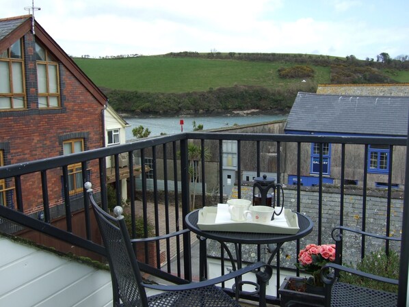 Balcone sul tetto - un piccolo balcone di fronte a S. E con ponte in legno e posti a sedere. Piacevole in qualsiasi momento della giornata è particolarmente piacevole al mattino, catturando il meglio del sole del mattino. Il balcone guarda verso Batson Creek con il suo traffico di barche che passa e ha una bella vista della penisola di Snape oltre.